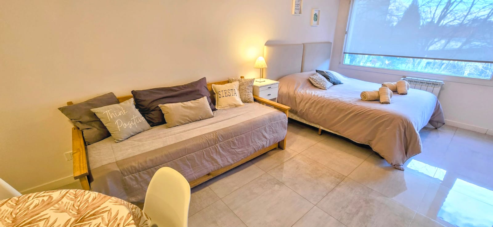 El espacio cuenta con una cama matrimonial que puede separarse en dos individuales, además de una cama adicional o sofá para mayor flexibilidad.