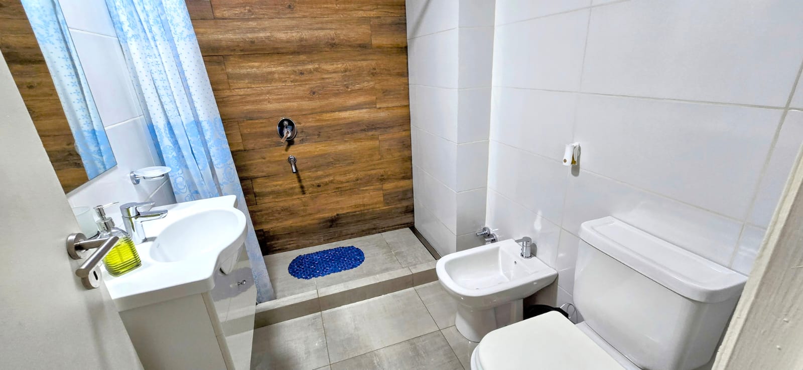 Baño completo con ducha, moderno y funcional.