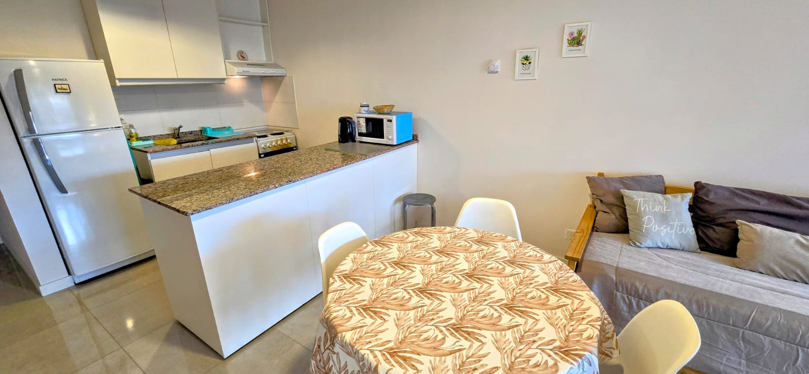 La cocina está completamente equipada con horno, heladera con freezer, microondas y pava eléctrica, perfecta para preparar tus comidas como en casa.