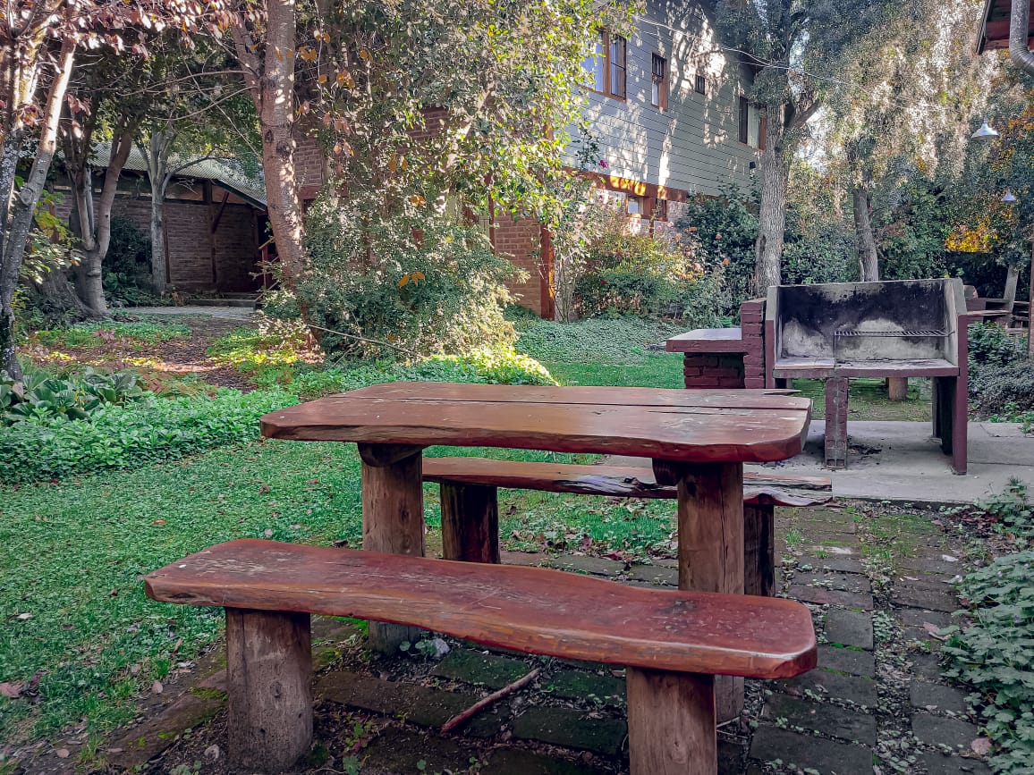 El espacio exterior es un verdadero encanto, con un amplio jardín que incluye mesas y sillas para disfrutar al aire libre, además de una parrilla y un quincho con todo lo necesario para compartir comidas en un ambiente relajado.