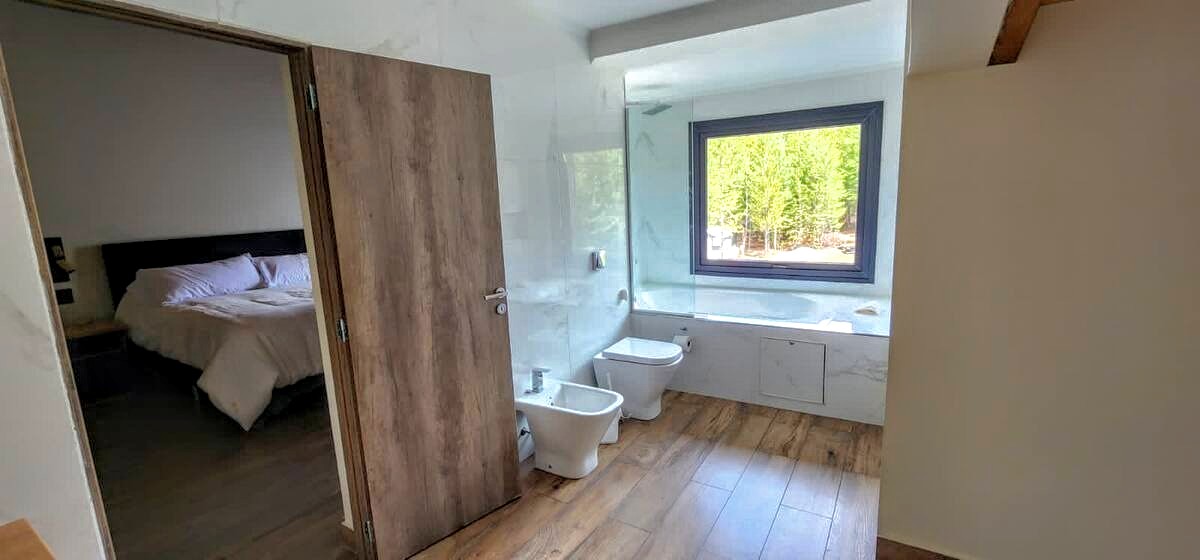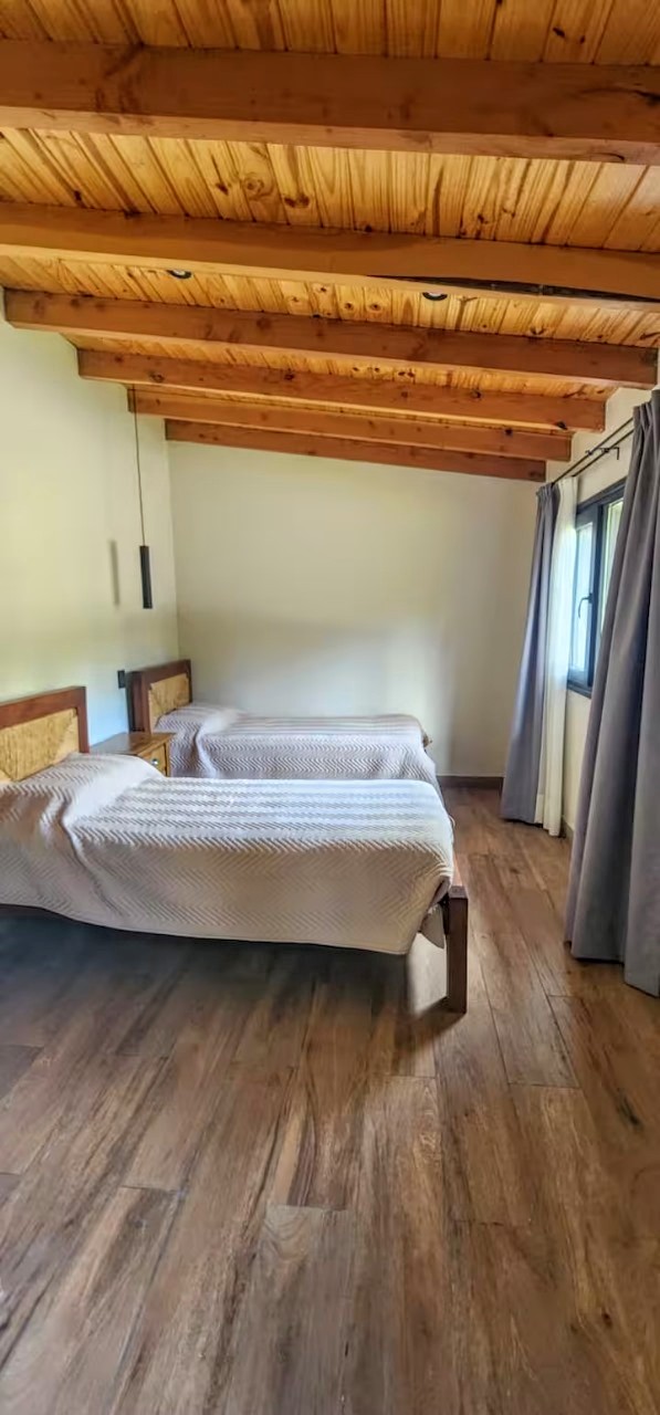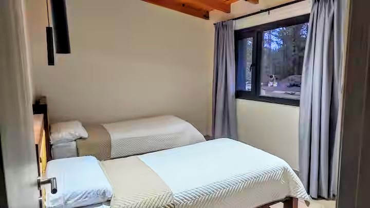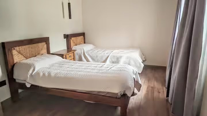 La casa se distribuye en dos habitaciones: una amplia suite matrimonial con baño privado y jacuzzi para relajarte al final del día, y una segunda habitación con dos camas individuales, perfecta para familiares o amigos. Además, cuenta con un segundo baño completo con ducha.