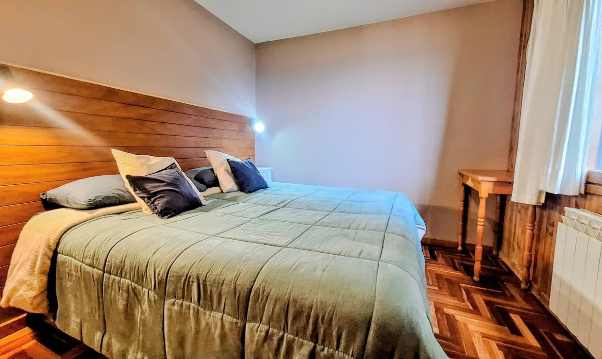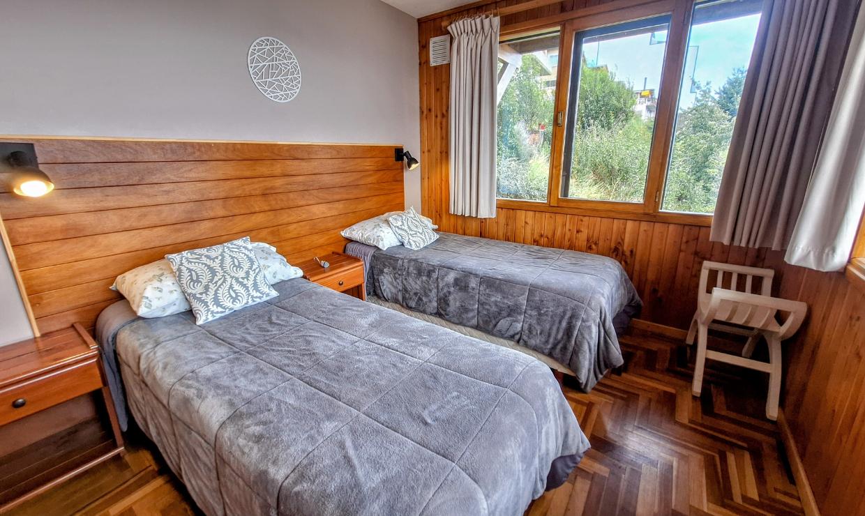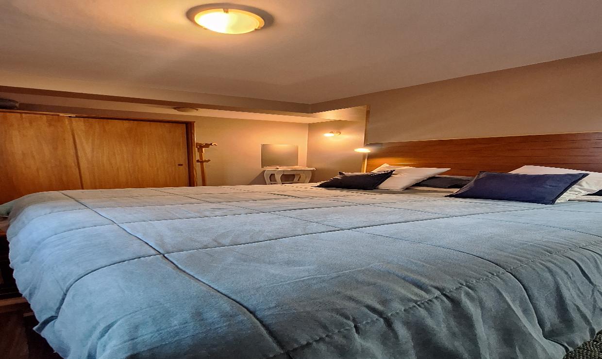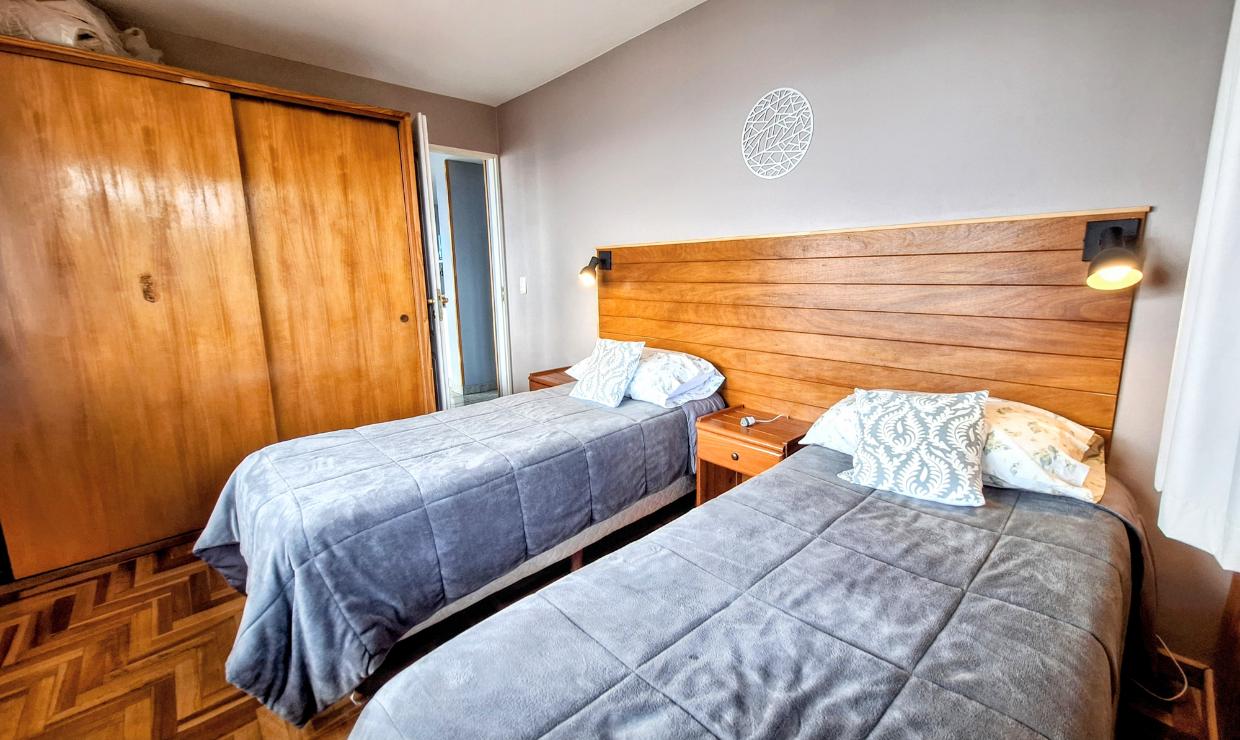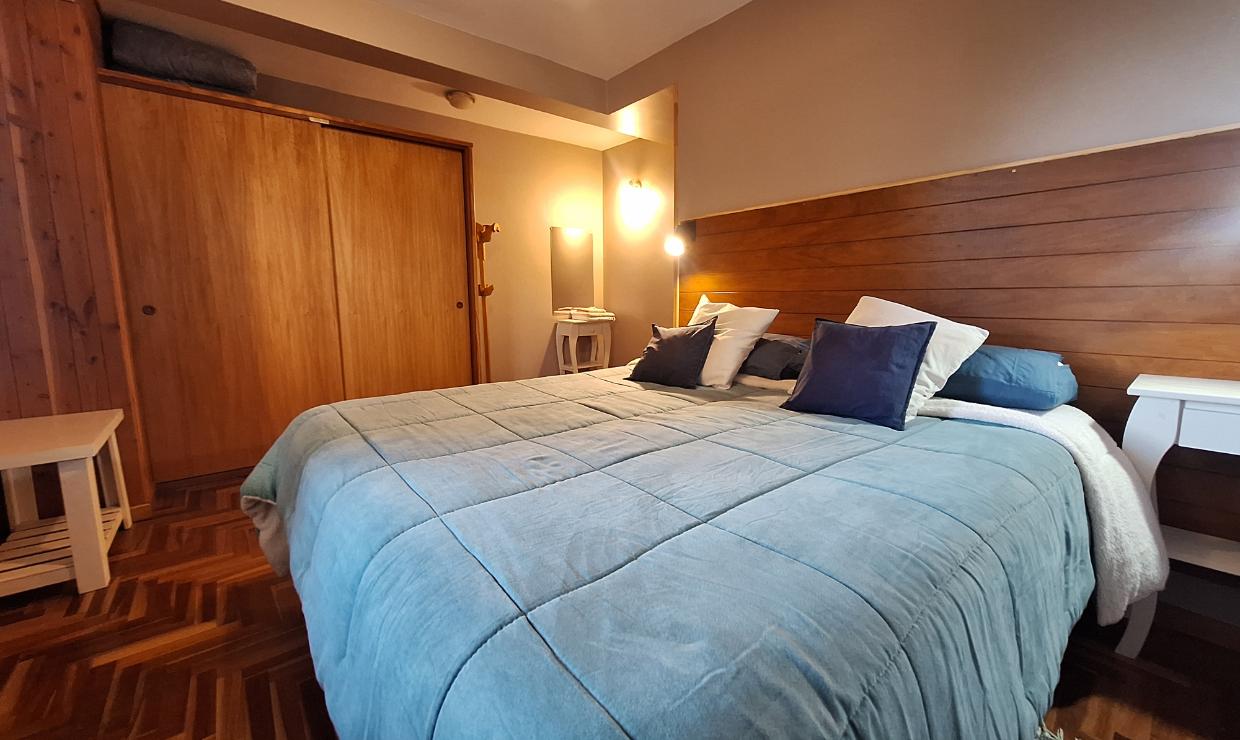 Cuenta con una habitación principal con cama matrimonial, que puede adaptarse a dos camas individuales según la necesidad, y una segunda habitación con dos camas simples. Dispone de un baño completo y un acogedor living con una cama adicional para un quinto huésped.