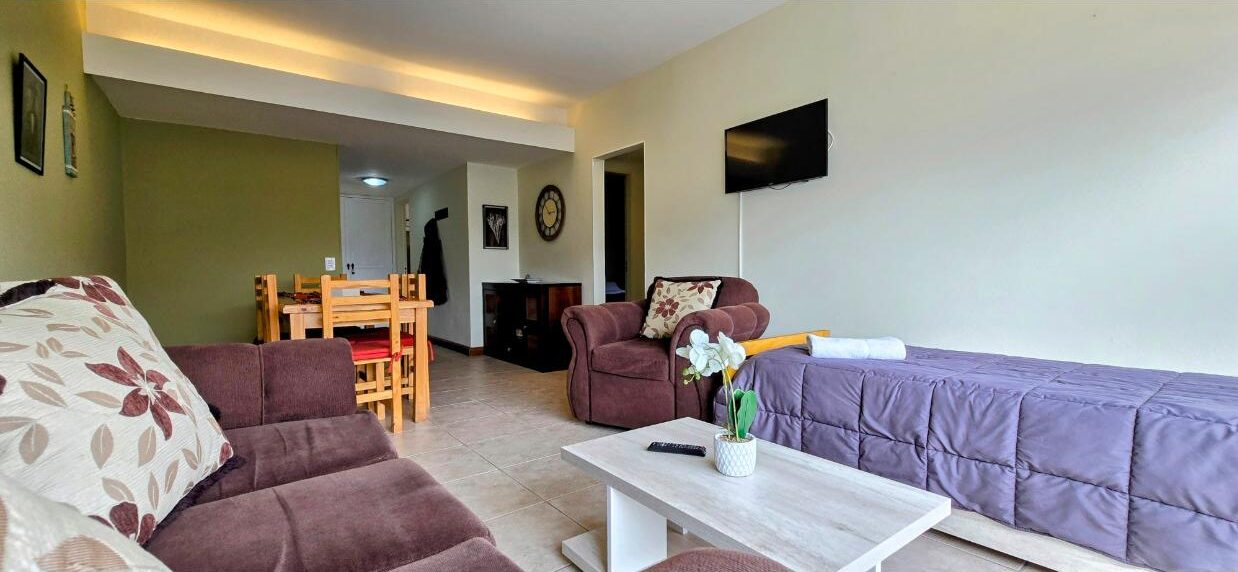 El amplio living comedor invita a relajarse y disfrutar del paisaje. La cocina está totalmente equipada con horno, freezer y pava eléctrica, además de lavarropas y plancha para mayor confort.