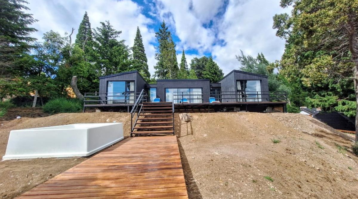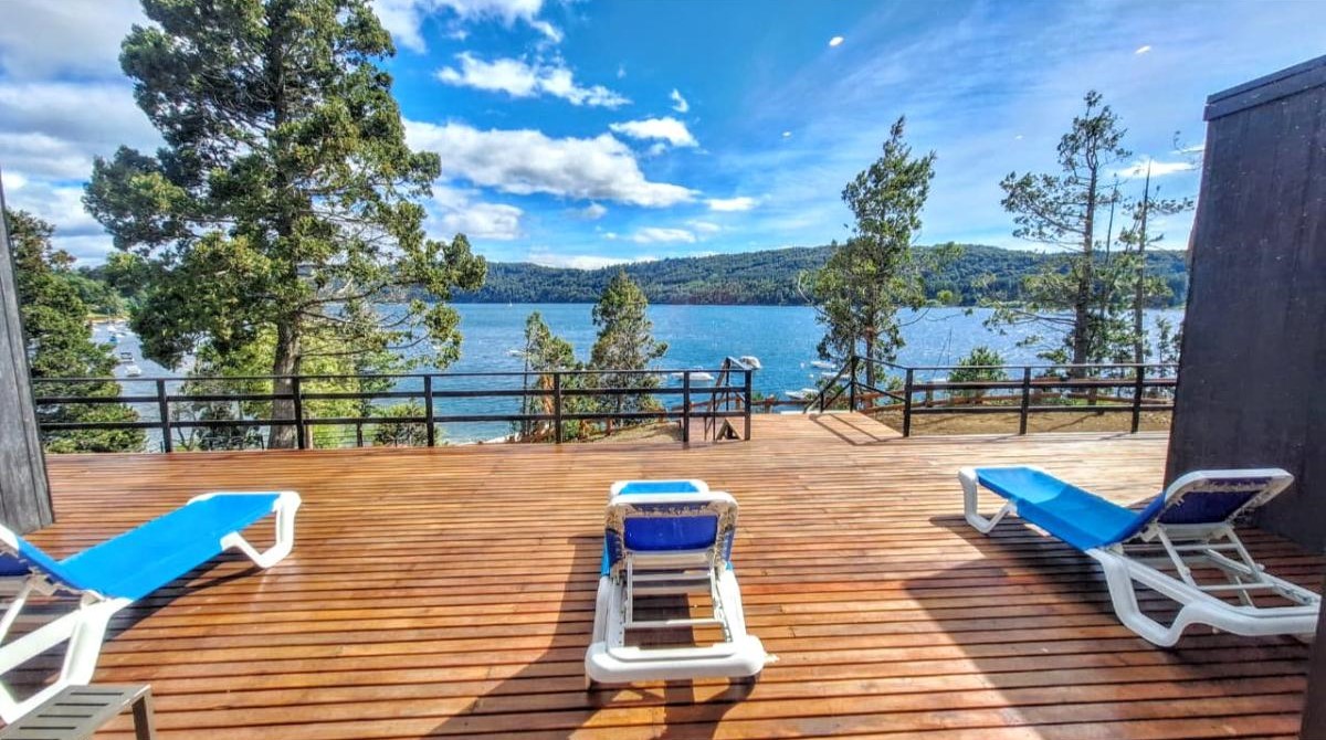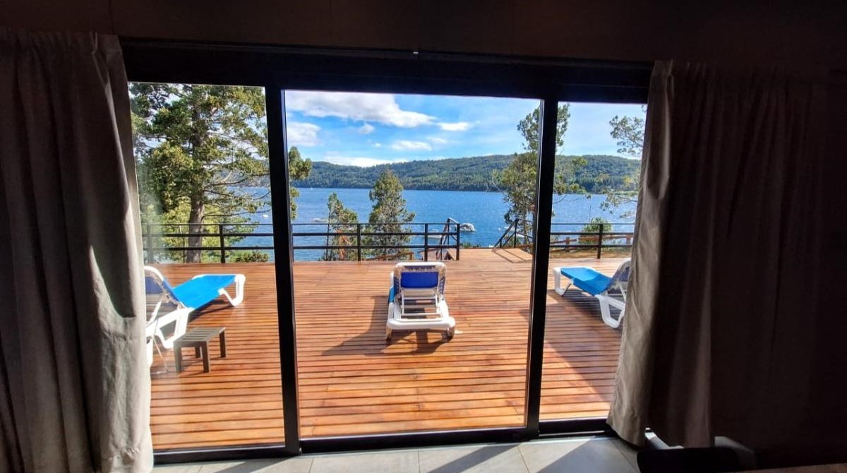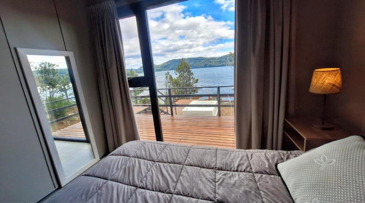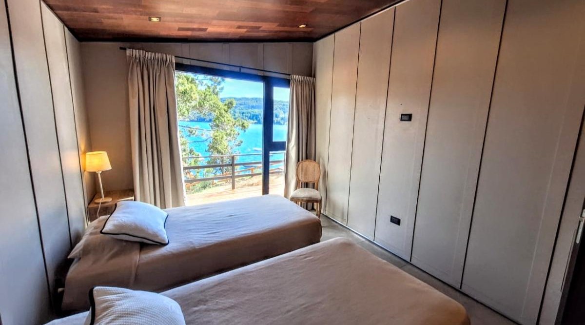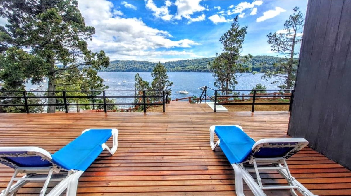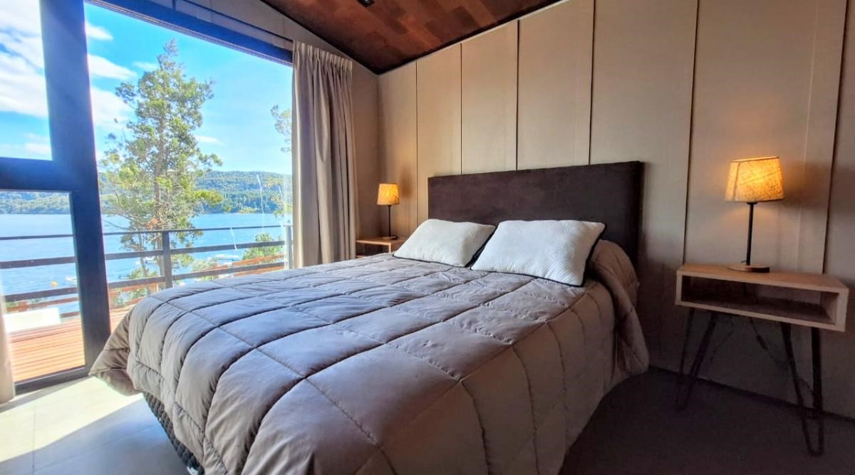 Sus ambientes luminosos y contemporáneos se abren hacia maravillosas vistas al brazo Campanario del Lago Nahuel Huapi, creando una conexión permanente con el paisaje patagónico. El acceso directo a la costa transforma cada día en una experiencia especial: amaneceres calmos junto al agua, tardes contemplando el reflejo de las montañas y noches donde el lago parece detener el tiempo.