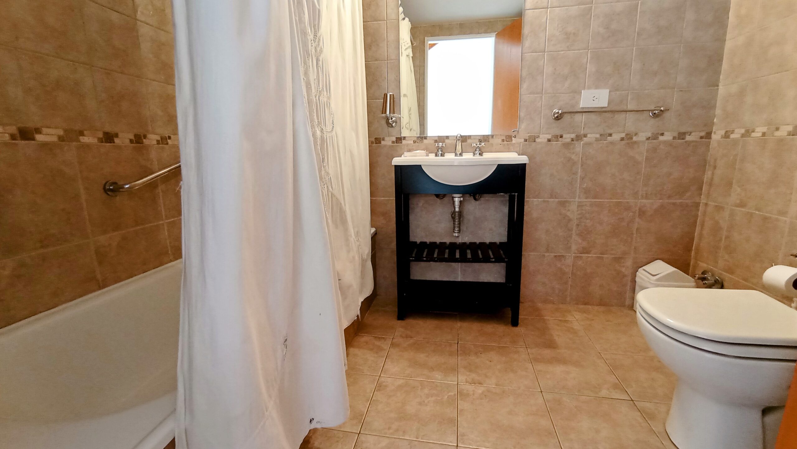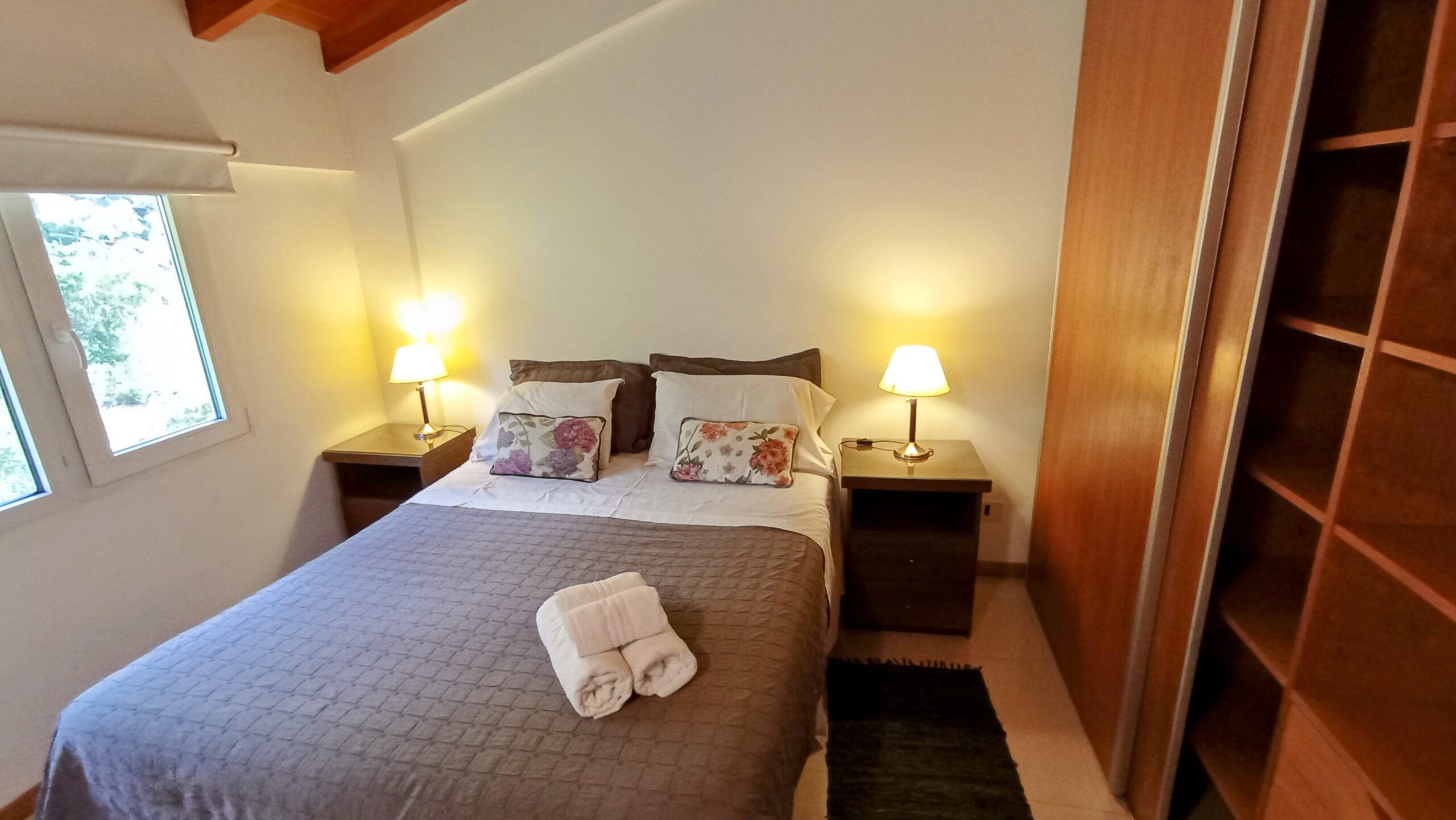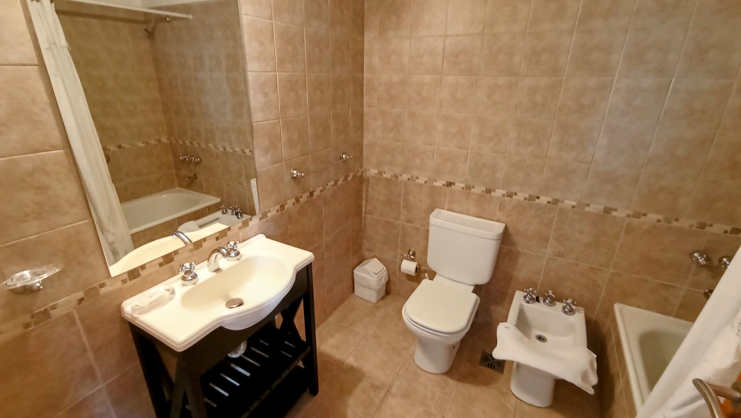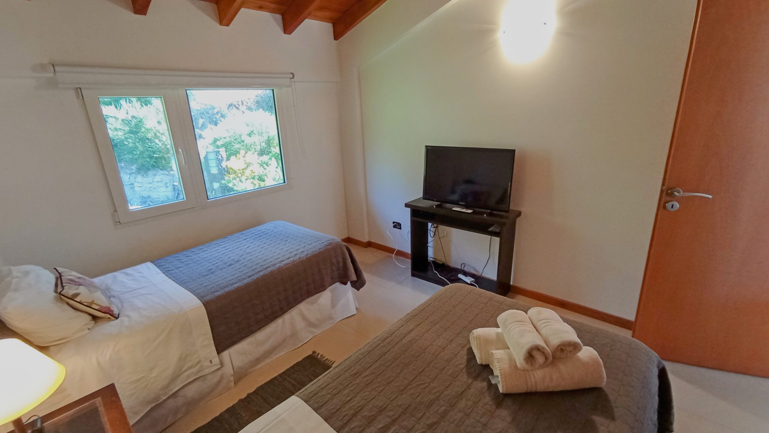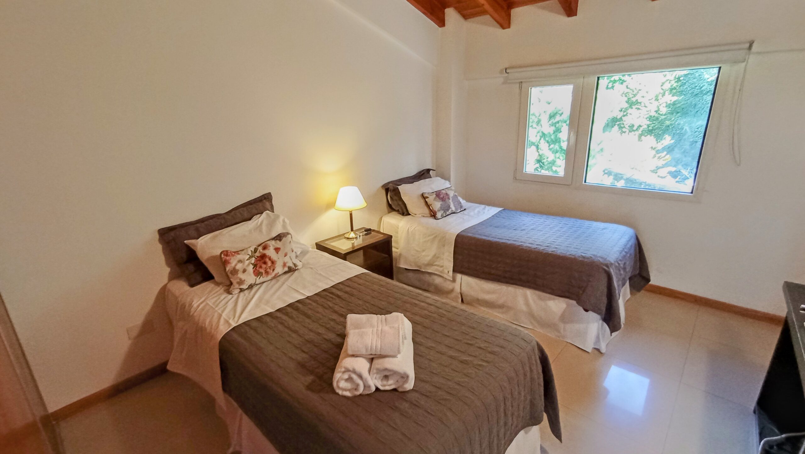 En el primer piso, la habitación principal ofrece una cama matrimonial y una vista que invita al descanso profundo. La segunda habitación, con dos camas individuales, es perfecta para familias o amigos. El baño completo con bañera suma comodidad y relax al final del día.